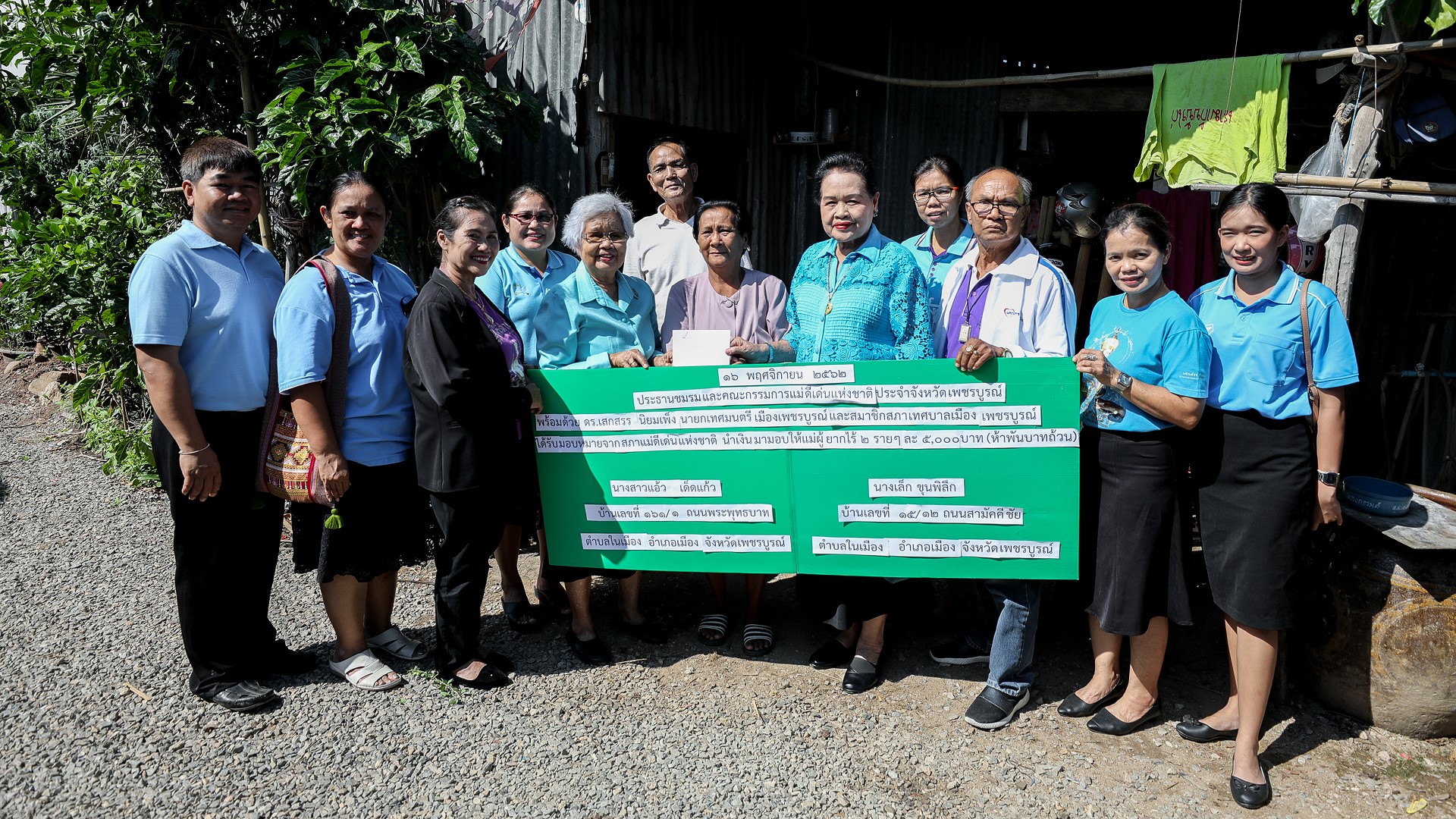 สำหรับเงินช่วยเหลือแม่ผู้ยากไร้ดังกล่าว ได้รับมาจากสภาแม่ดีเด่นแห่งชาติ โดยมอบให้กับแม่ผู้ยากไร้ จำนวน 2 ราย ในเขตเทศบาลเมืองเพชรบูรณ์ รายละ 5,000 บาท ได้แก่ นางสาวแอ้ว เด็ดแก้ว ชาวบ้านชุมชนที่ 13 (ภูเขาดินพัฒนา) อาศัยอยู่บ้านเลขที่ 161/1 ถ.พระพุทธบาท ต.ในเมือง อ.เมืองเพชรบูรณ์ จ.เพชรบูรณ์ และ นางเล็ก ขุนพิลึก ชาวบ้านชุมชนที่ 14 (คลองศาลาพัฒนา) อาศัยอยู่บ้านเลขที่ 15/12 ถ.สามัคคีชัย ต.ในเมือง อ.เมืองเพชรบูรณ์ จ.เพชรบูรณ์