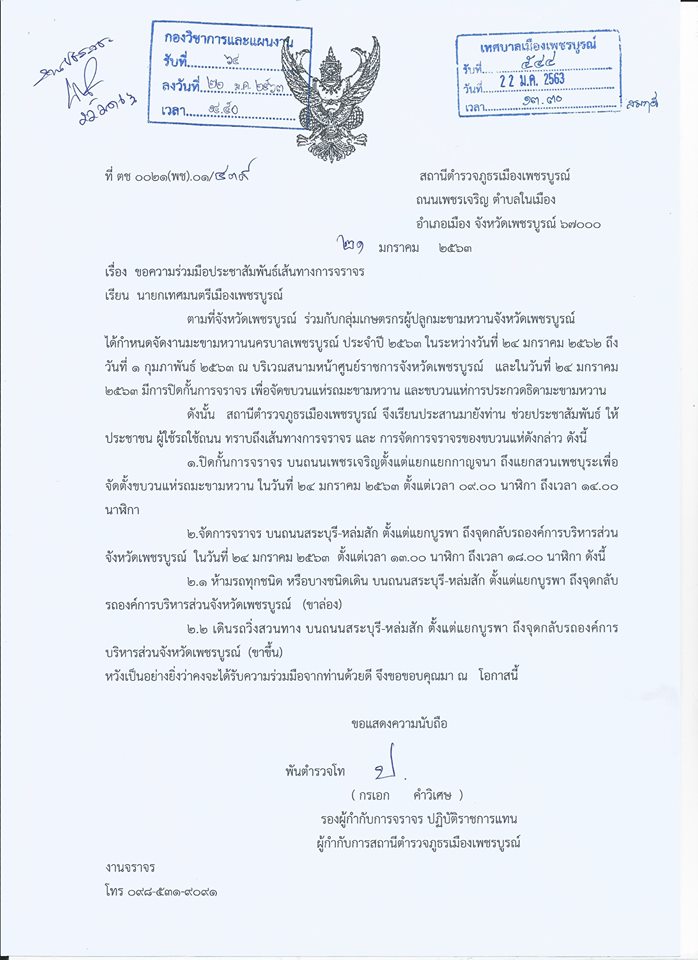 ตามที่จีงหวัดเพชรบูรณ์ ร่วมกับกลุ่มเกษตรกรผู้ปลูกมะขามหวานจังหวัดเพชรบูรณ์ ได้กำหนเจัดงานมะขามหวานนครบาลเพชรบูรณ์ ประจำปี 2563 ในระหว่างวันที่ 24 มกราคม 2562 ถึง วันที่ 1 กุมภาพันธ์ 2563 ณ บริเวณสนามหน้าศูนย์ราชการจังหวัดเพชรบูรร์ และในวันที่ 24 มกราคาม 2563 มีการปิดกั้นการจราจร เพื่อจัดขบวนแห่มะขามหวาน และขบวนแห่การประกวดธิดามะขามหวาน