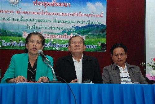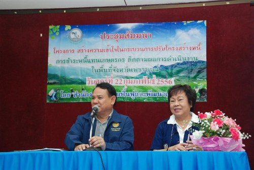 เมื่อเวลา 13.00 น. วันที่ 22 ก.พ.2556 นายสุชาติ ราษฎร์ดุษดี รองผู้ว่าราชการจังหวัดเพชรบูรณ์ เป็นประธานเปิดการประชุมชี้แจงแนวทางแก้ไขปัญหาหนี้สินของเกษตรกร ณ ห้องประชุมชาญอนุสรณ์ เทศบาลเมืองเพชรบูรณ์ มี นางกันยาวีร์ สุรางคพาณิชย์ รักษาการหัวหน้าสำนักงานกองทุนฟื้นฟูและเกษตรกรสาขา จ.เพชรบูรณ์ กล่าวรายงาน พร้อมกันนี้คณะกรรมการแก้ไขปัญหาหนี้สินแห่งชาติ นำโดย นายฉลาด ขามข่วง ประธานคณะกรรมาธิการ นางวันเพ็ญ พร้อมพัฒน์ กรรมาธิการที่ปรึกษา และคณะอนุกรรมาธิการพิจารณาปัญหาหนี้สินภาคประชาชน พบปะเกษตรกรจากทั้ง 11 อำเภอ ที่มาร่วมการประชุม