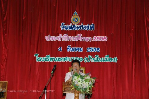 เมื่อเวลา 09.15 น. วันที่ 4 ธ.ค.2556 นายเสกสรร นิยมเพ็ง นายกเทศมนตรีเมืองเพชรบูรณ์ เป็นประธานเปิดงานวันพ่อโรงเรียนเทศบาล 1 (บ้านในเมือง) นายประมูล พูลประเสริฐ ผู้อำนวยการโรงเรียนกล่าวรายงาน มีคณะผู้บริหารปลัดเทศบาล สมาชิกสภาเทศบาล คณะกรรมการสถานศึกษา และแขกผู้มีเกียรติอีกหลายท่าน นอกจากนี่้ นายกประทิน นาคสำราญ นายกองค์การบริหารส่วนตำบลสะเดียง ให้เกียรติมาร่วมงานด้วย หลังพิธีเปิดมีการมอบโล่พ่อตัวอย่าง และมอบทุนการศึกษาให้กับนักเรียน