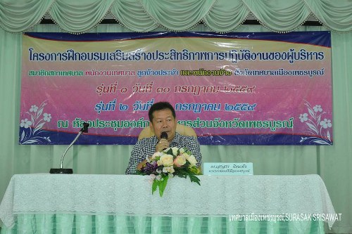 เมื่อเวลา 09.00 น. วันที่ 30 กรกฎาคม 2559 ณ ห้องประชุมองค์การบริหารส่วนจังหวัดเพชรบูรณ์ ดร.เสกสรร นิยมเพ็ง นายกเทศมนตรีเมืองเพชรบูรณ์ เป็นประธานในพิธีเปิดโครงการฝึกอบรมเสริมสร้างประสิทธิภาพการปฏิบัตงานของผู้บริหาร สมาชิกสภาเทศบาล พนักงานเทศบาล ลูกจ้างประจำพนักงานจ้าง สังกัดเทศบาลเมืองเพชรบูรณ์ โดยมีนายนราวุธ กุนาคำ รองนายกเทศมนตรีเมืองเพชรบูรณ์ กล่าวรายงาน มีนายเดชเลิศ ม่วงอ่ำ รองนายกฯ นส.สุณี มังคลารัตนศรี ปลัดเทศบาลฯ รองปลัด สมาชิกสภา ผู้อำนวยการพนักงานเทศบาล เข้าร่วมอบรมอย่างพร้อมเพียงกัน