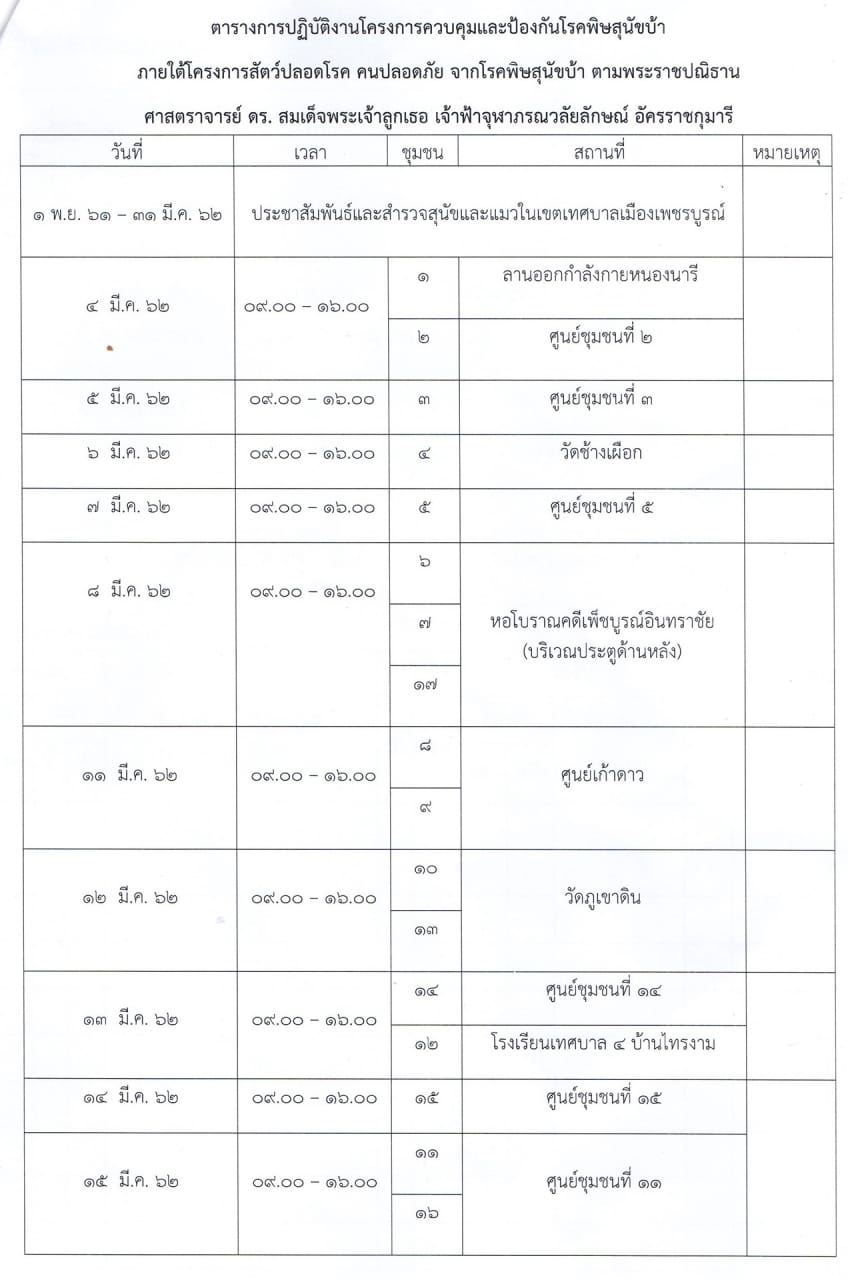 สำหรับประชาชนในเขตเทศบาลเมืองเพชรบูรณ์ที่ต้องการรับบริการ ให้นำบัตรประจำตัวประชาชนของเจ้าของสุนัขและแมวมาด้วย และขอให้ท่านนำเหรียญเครื่องหมายรับรองการฉีดวัคซีน แขวนคอสุนัขและแมวของท่าน ซึ่งในปี 2562 นี้เทศบาลเมืองเพชรบูรณ์จะดำเนินการในระหว่างวันที่ 4 - 15 มีนาคม 2562 ตั้งแต่เวลา 09.00 น. - 16.00 น. ตามสถานที่สำคัญๆของชุมชน ตามตาราง ดังนี้