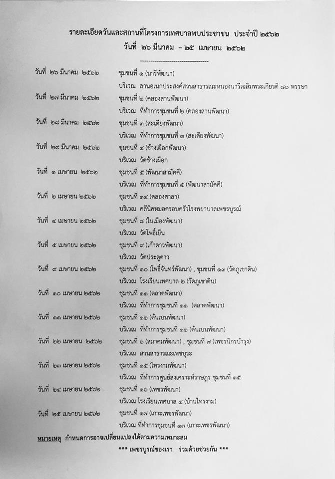 เทศบาลเมืองเพชรบูรณ์ จึงขอเชิญชวนประชาชนในเขตตำบลในเมือง ทั้ง 17 ชุมชนได้ เข้าร่วมโครงการเทศบาลพบประชาชน ประจำปี 2562 ตั้งแต่เวลา 17.00 น. เป็นต้นไป ตามเอกสารแนบมาด้านล่าง ดังนี้